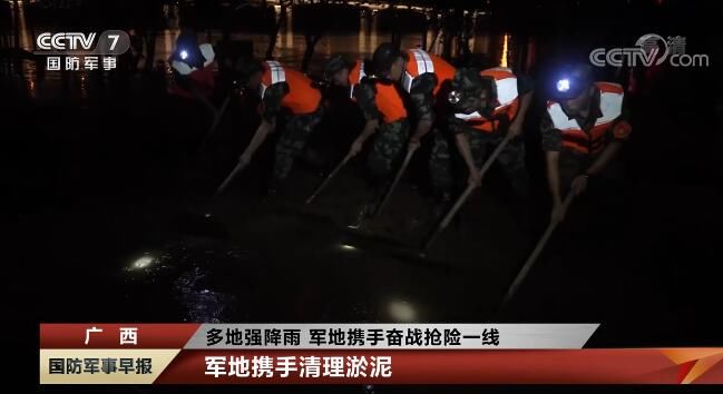 在广西柳州,洪水退后路面上留下大量的淤泥和垃圾。武警广西总队柳州支队官兵和当地民兵迅速赶赴现场,展开清淤工作。